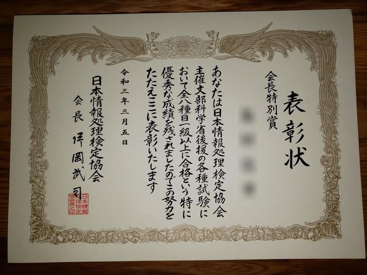 日本情報処理検定協会の資格については、当時基準で1級以上8種目全て(当時は8種目しかありませんでした。)取得したため、卒業式の日に会長特別賞を受賞しました。